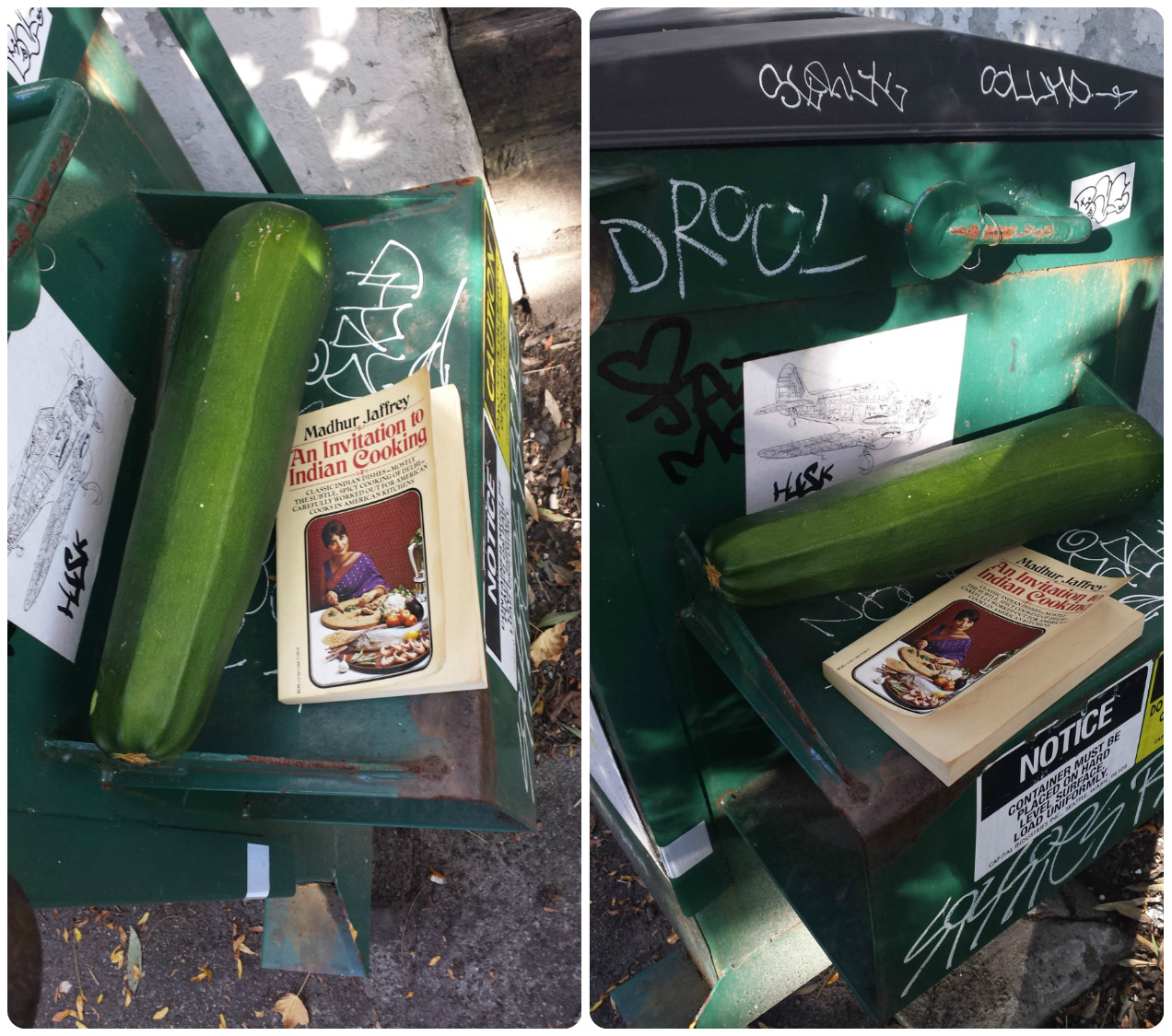 *Una zucchina accompagnata al libro: “Un’introduzione alla cucina Indiana”. **Il fatto che sia accanto ad un bidone della spazzatura mi fa pensare che a questa persona non piaccia la cucina indiana. Peccato, non sa cosa si perde! Il cibo indiano è ultra-buono! *